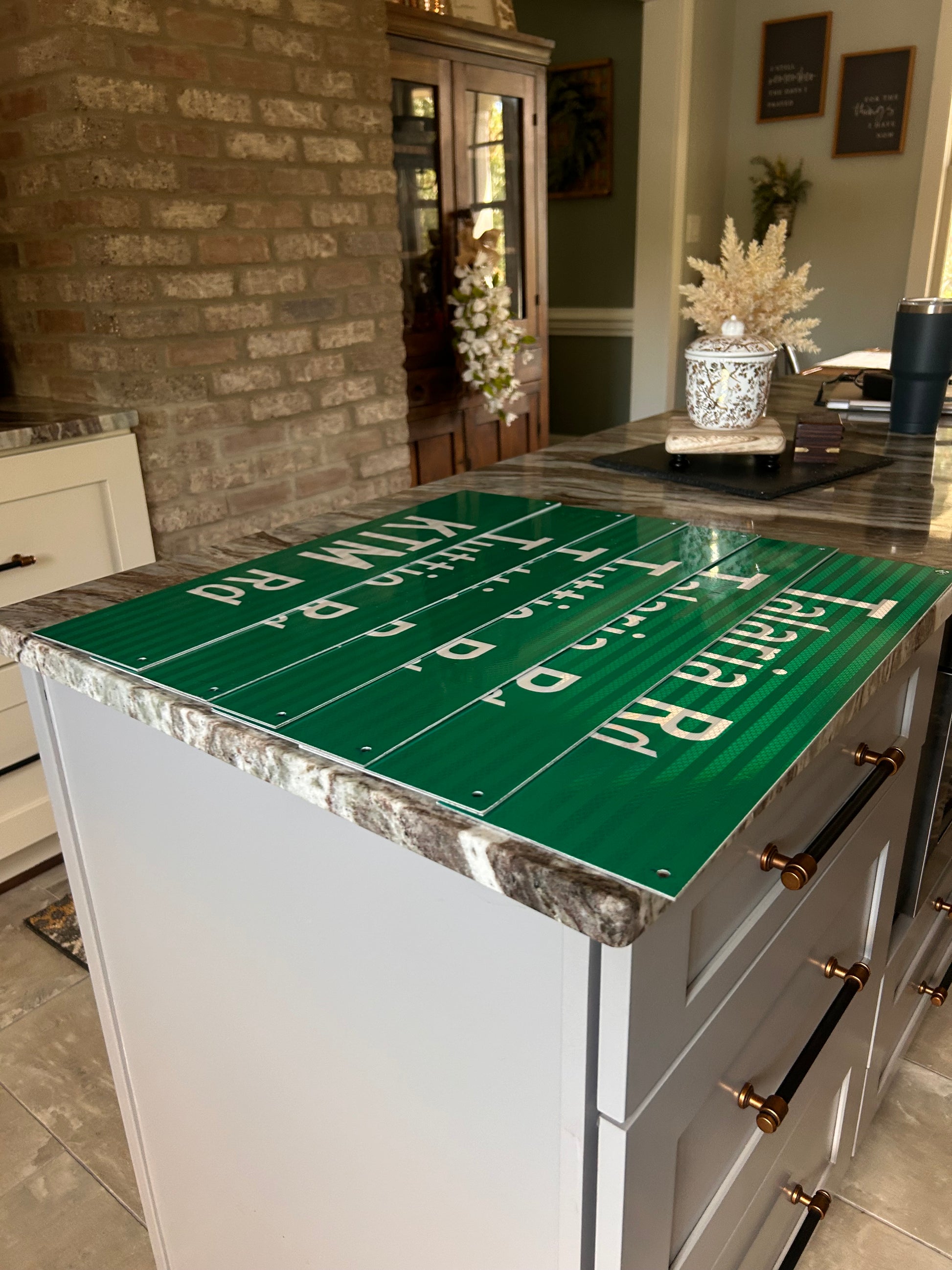 Each sign is built from durable, street-grade aluminum with a bright reflective finish that shines beautifully at night. Choose your color (red, blue, or green) and add any custom text or suffix you want — your street name, your family name, your RV spot, or something totally unique.